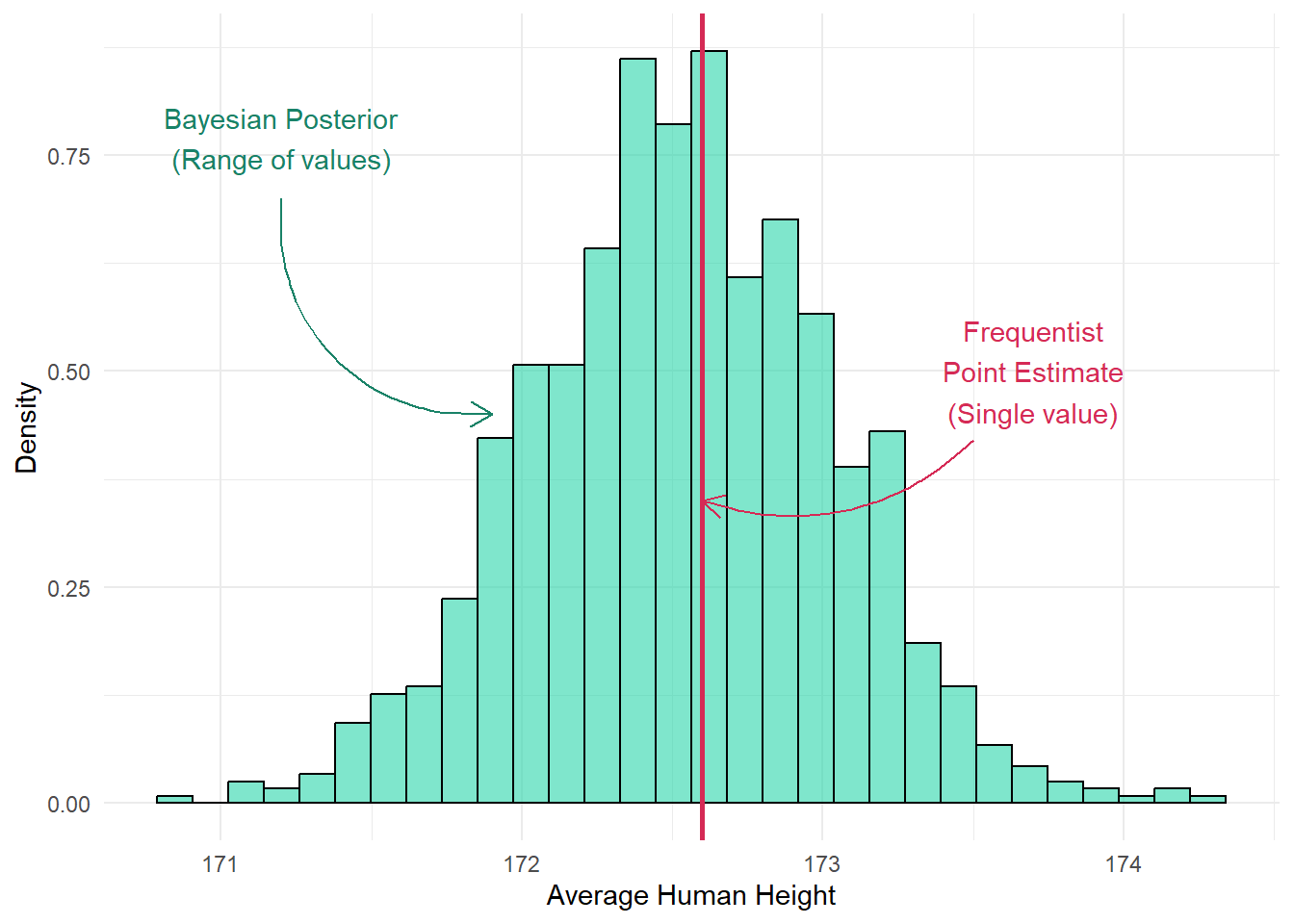 set.seed(42)posterior_samples <-rnorm(1000, mean =172.55, sd =0.5)posterior_df <-data.frame(value = posterior_samples)frequentist_est <-172.6frequentist_ci <-c(171.9, 173.5)bayes_ci <-quantile(posterior_samples, probs =c(0.025, 0.975))ggplot(posterior_df, aes(x = value)) +geom_histogram(aes(y = ..density..), bins =30, fill ="#2AD5AA", alpha =0.6, color ="black") +geom_vline(xintercept = frequentist_est, color ="#D52A55", linetype ="solid", size =1) +annotate("text", x =173.7, y =0.5, label ="Frequentist\nPoint Estimate\n(Single value)", color ="#D52A55") +annotate("text", x =171.2, y =0.77, label ="Bayesian Posterior\n(Range of values)", color ="#198267") +annotate("curve", x =171.2, xend =171.9, y =0.7, yend =0.45,curvature =0.5, arrow =arrow(length =unit(0.03, "npc")), color ="#198267") +annotate("curve", x =173.5, xend = frequentist_est, y =0.42, yend =0.35,curvature =-0.3, arrow =arrow(length =unit(0.03, "npc")), color ="#D52A55") +labs(x ="Average Human Height",y ="Density" ) +theme_minimal()