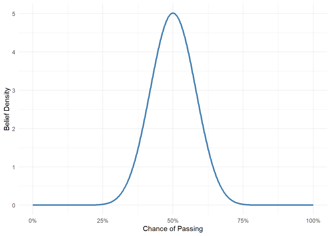 You start off thinking you have a 50% chance of passing. That doesn’t mean you’re certain that it’s exactly 50%. You might be unsure, so you’re open to the idea that it could be lower or higher.