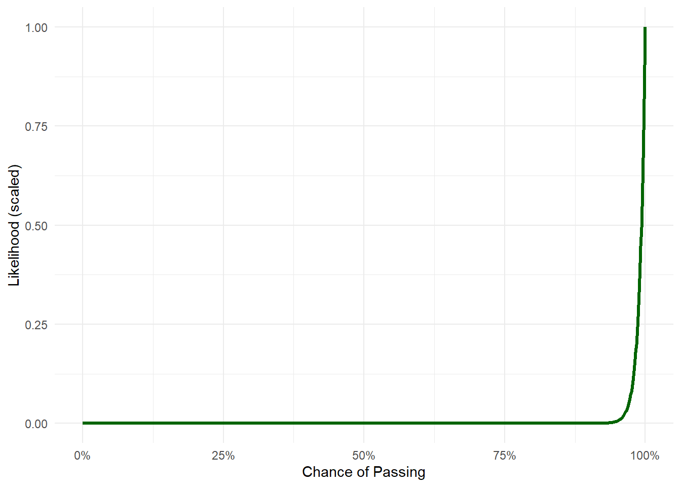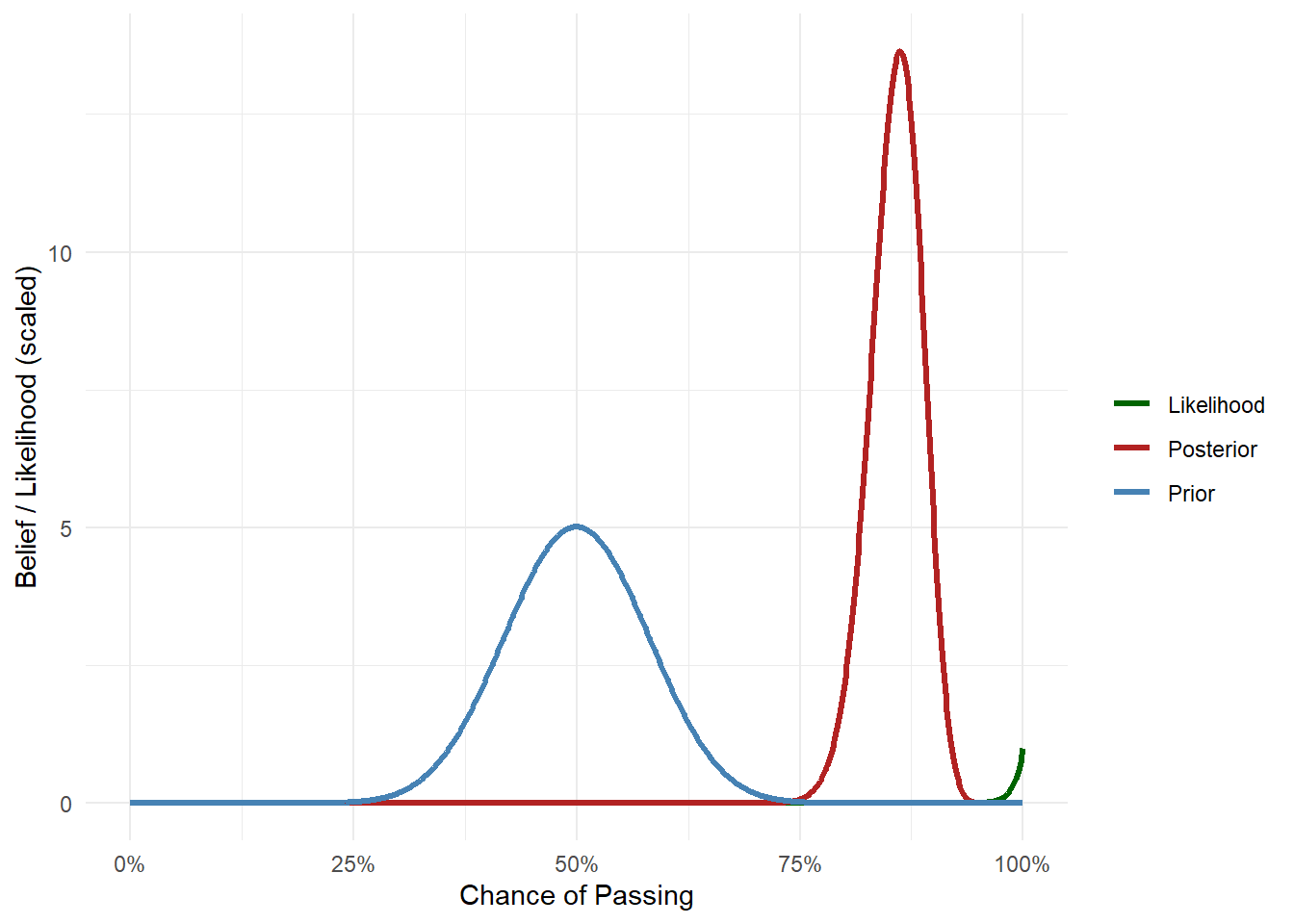 Now imagine I told you that I’ve supervised 100 students before, and every single one of them passed? That’s new data and it’s strong evidence that the pass rate is high, probably very close to 100%. In Bayesian terms, this data has a likelihood, which tells us how plausible different pass rates are, given what we’ve observed. Is it likely that the true pass rate is 0%, if all 100 students passed? Clearly not. What about 75%? That seems possible, but it doesn’t explain the data super well. A pass rate of 100%? That seems highly consistent with what we observed.