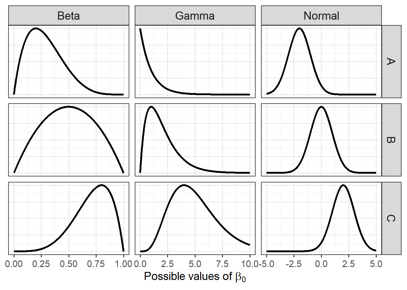 library(tidyr)x_beta <-seq(0, 1, length.out =1000)x_normal <-seq(-5, 5, length.out =1000)x_gamma <-seq(0, 10, length.out =1000)normalize <-function(y) y /max(y)beta_df <-bind_rows(tibble(x = x_beta, density =normalize(dbeta(x_beta, 2, 5)), Distribution ="Beta", Variant ="A"),tibble(x = x_beta, density =normalize(dbeta(x_beta, 2, 2)), Distribution ="Beta", Variant ="B"),tibble(x = x_beta, density =normalize(dbeta(x_beta, 5, 2)), Distribution ="Beta", Variant ="C"))normal_df <-bind_rows(tibble(x = x_normal, density =normalize(dnorm(x_normal, -2, 1)), Distribution ="Normal", Variant ="A"),tibble(x = x_normal, density =normalize(dnorm(x_normal, 0, 1)), Distribution ="Normal", Variant ="B"),tibble(x = x_normal, density =normalize(dnorm(x_normal, 2, 1)), Distribution ="Normal", Variant ="C"))gamma_df <-bind_rows(tibble(x = x_gamma, density =normalize(dgamma(x_gamma, shape =1, rate =1)), Distribution ="Gamma", Variant ="A"),tibble(x = x_gamma, density =normalize(dgamma(x_gamma, shape =2, rate =1)), Distribution ="Gamma", Variant ="B"),tibble(x = x_gamma, density =normalize(dgamma(x_gamma, shape =5, rate =1)), Distribution ="Gamma", Variant ="C"))df <-bind_rows(beta_df, normal_df, gamma_df)ggplot(df, aes(x = x, y = density)) +geom_line(size =1.1) +facet_grid(cols =vars(Distribution), rows =vars(Variant), scales ="free_x") +labs(x =expression("Possible values of "* beta[0]),y =NULL ) +theme_bw(base_size =14) +theme(axis.text.y =element_blank(),axis.ticks.y =element_blank(),strip.text =element_text(size =14) )