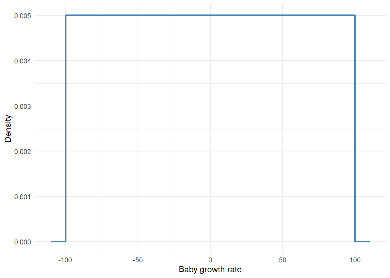 Which basically says, I don’t know what baby growth rate is, but it’s probably between -100 and 100 cm per year. You can always change the values to e.g. \(Uniform(-1, 1)\) or \(Uniform(0,1)\). The important part is that the \(Uniform\) distribution does not have a peak, a region where you think some values are more likely than others. In the above figure, I’m saying that baby growth rate could be anywhere from -100 to 100 with equal probability.