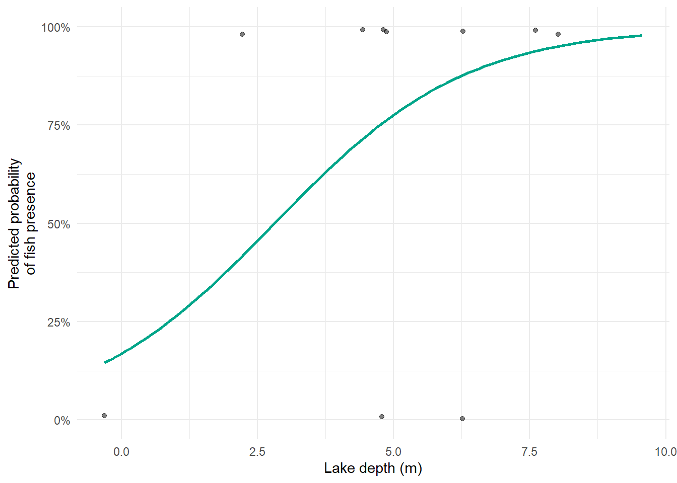 glm(formula = fish ~ depth, family = binomial, data = lakes)