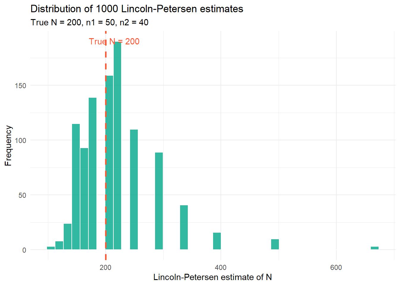 A few things worth noticing here. First, the distribution of estimates is centred roughly around the true value of 200, which is reassuring. The estimator is not systematically wrong. Second, the distribution has a long right tail, meaning we occasionally get wildly large estimates. This happens when \(m_2\) is small by chance; if you only recapture 2 or 3 tagged fish, the formula spits out a very large \(\hat{N}\). This is one reason the estimator works poorly when recaptures are rare.