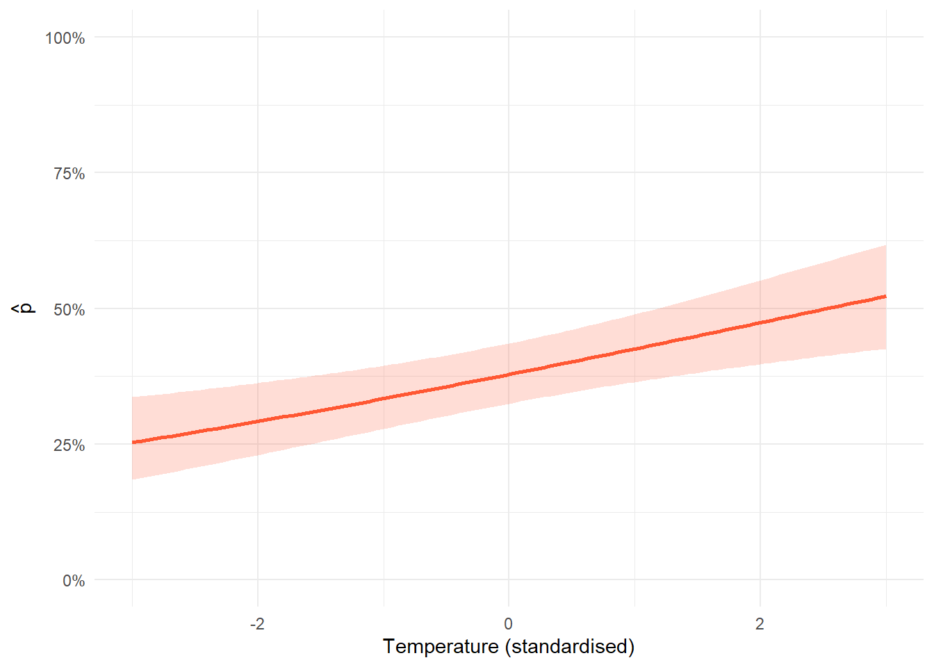 The confidence interval is calculated using the delta method, which propagates uncertainty from both the intercept and slope through the inverse logit transformation. The key thing to look at here is whether the interval overlaps a flat line at any particular probability: if the lower bound is clearly above or the upper bound clearly below a reference value, that is evidence of a real effect.