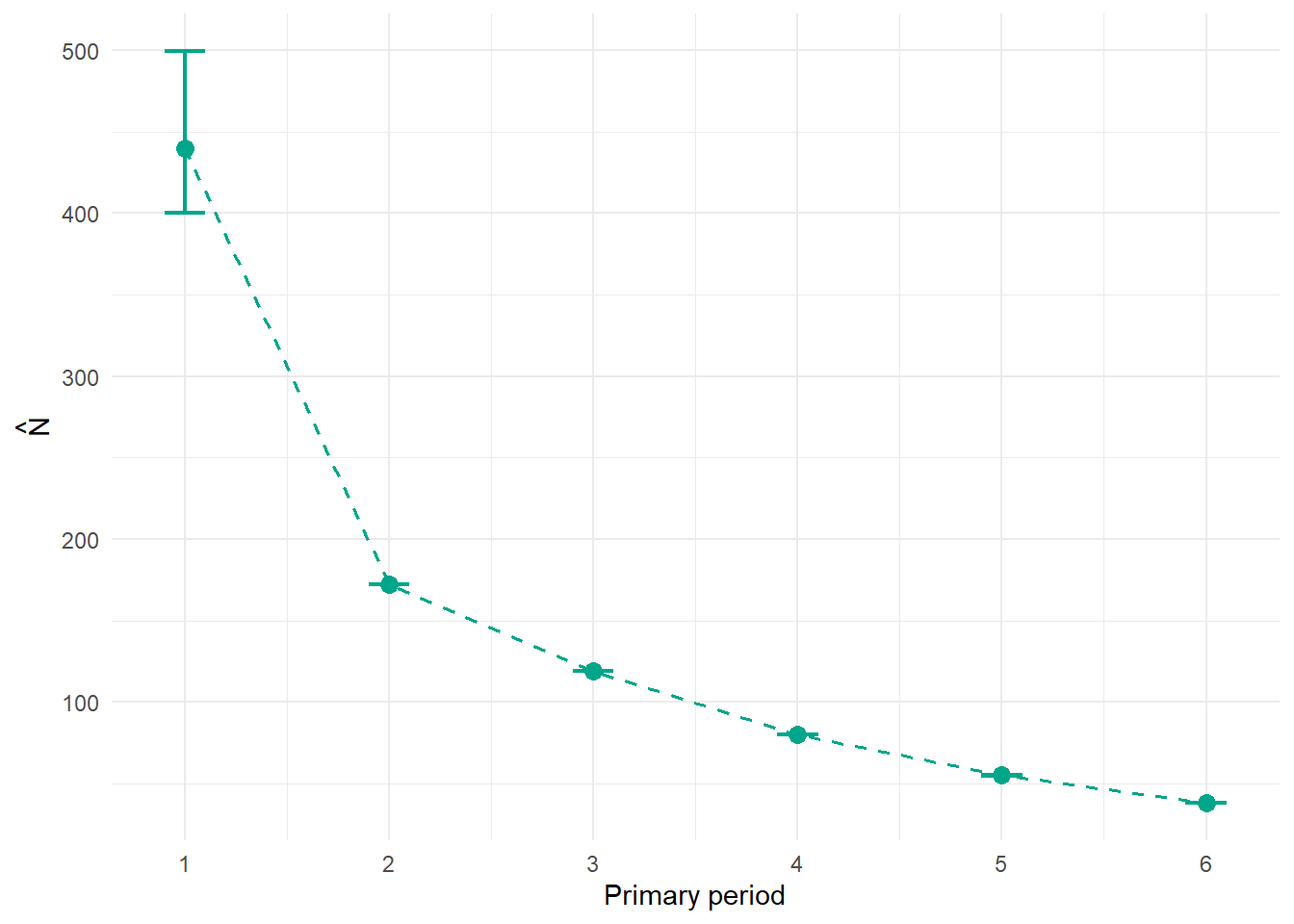 The per-period population size \(\hat{N}_t\) is one of the headline outputs of a robust design study. In RMark it is derived from the f0 parameter, which represents the estimated number of individuals that were present but never detected in each primary period. Add the observed count to f0 and you have \(\hat{N}_t\).